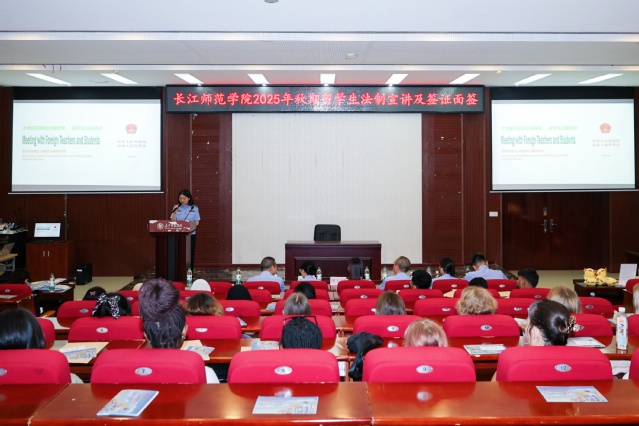 为帮助2025级留学生新生深入掌握在华法律法规知识、顺畅办理签证手续,9月18日下午,国际学院在玉衡学术报告厅开展了2025年秋季留学生法治宣讲及签证面签活动。重庆市公安局出入境管理总队境外人员管理支队领馆大队长舒林、涪陵区公安局出入境管理支队支队长席玥、副支队长段勇,长江师范学院国际学院院长黄东梅和其他相关人员一同参与此次活动。